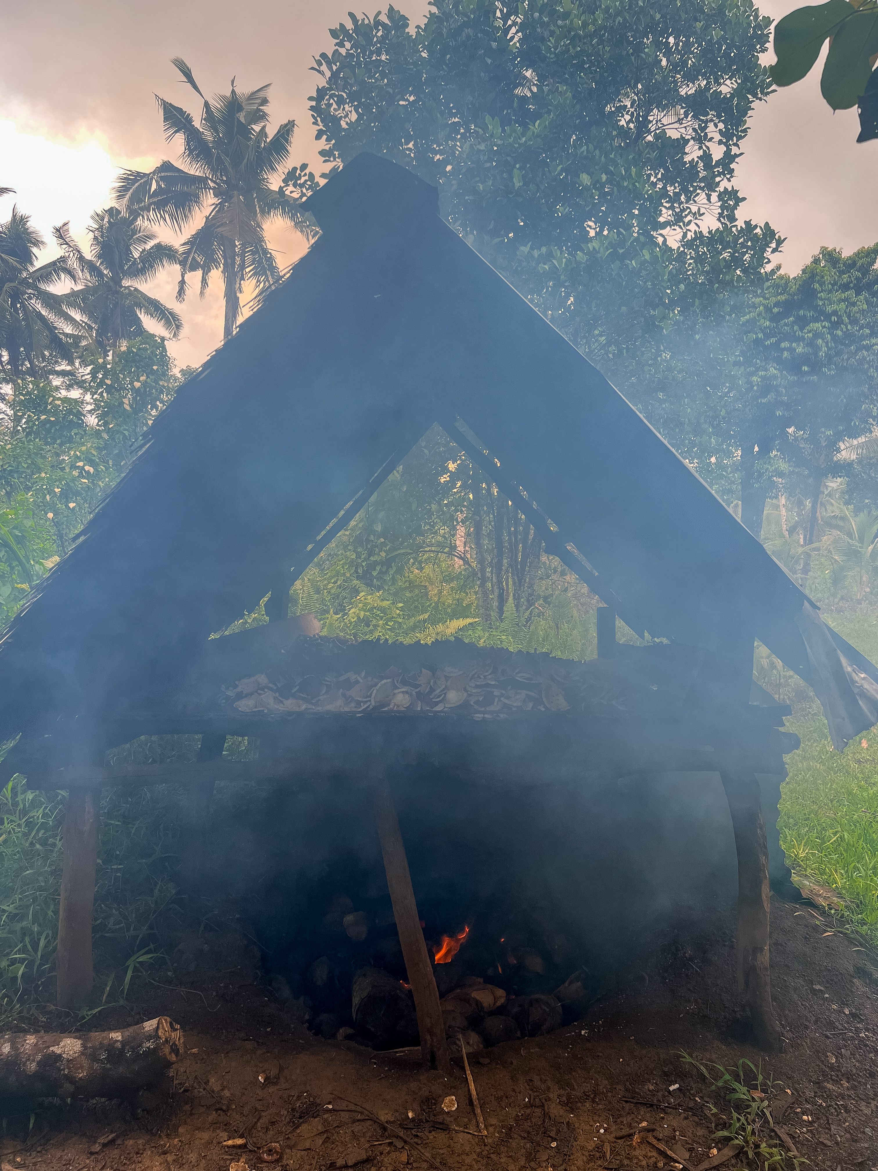 A hole in the ground where firewood or in this case coconut shells and husks get burned to smoke and dry the material one level above.