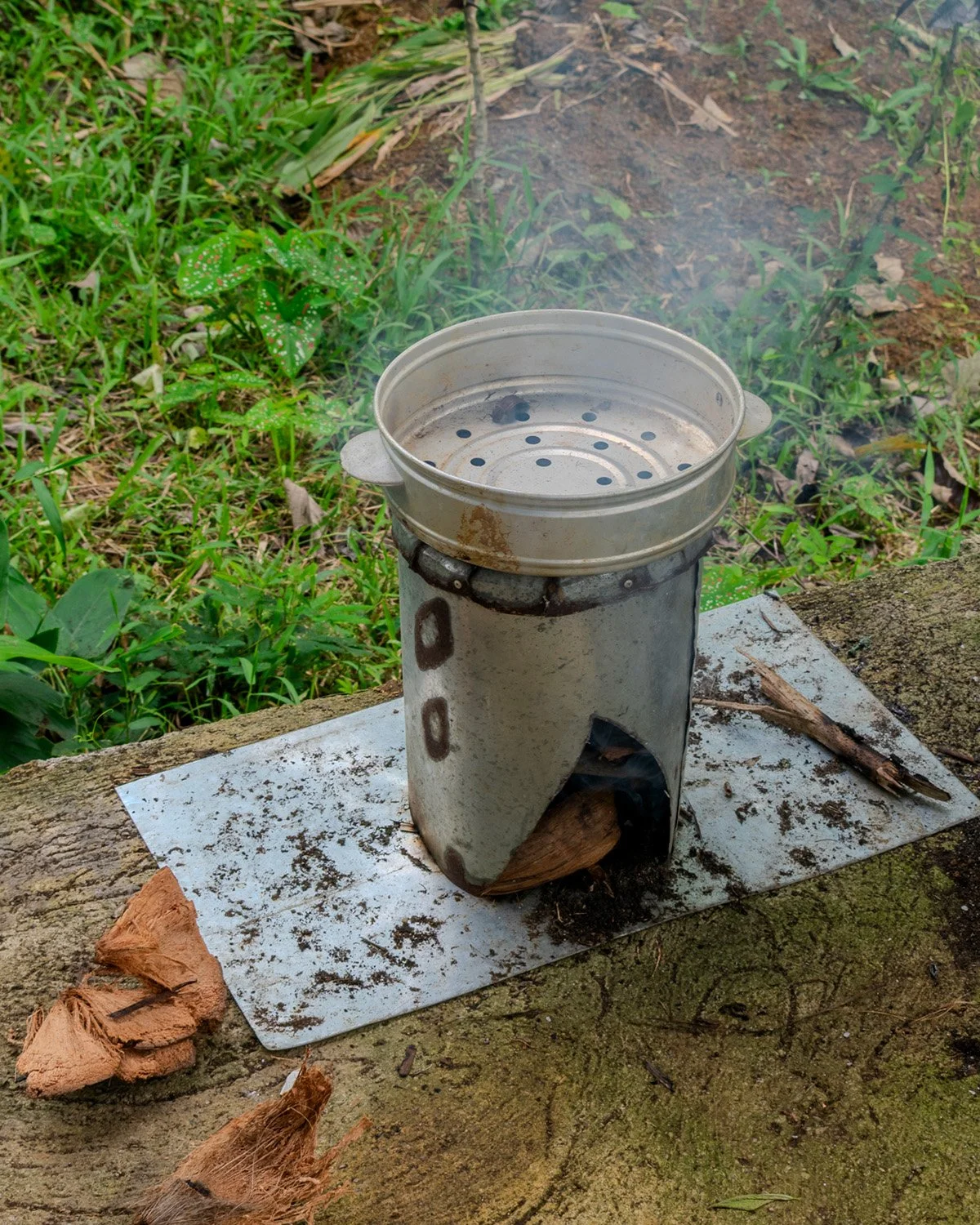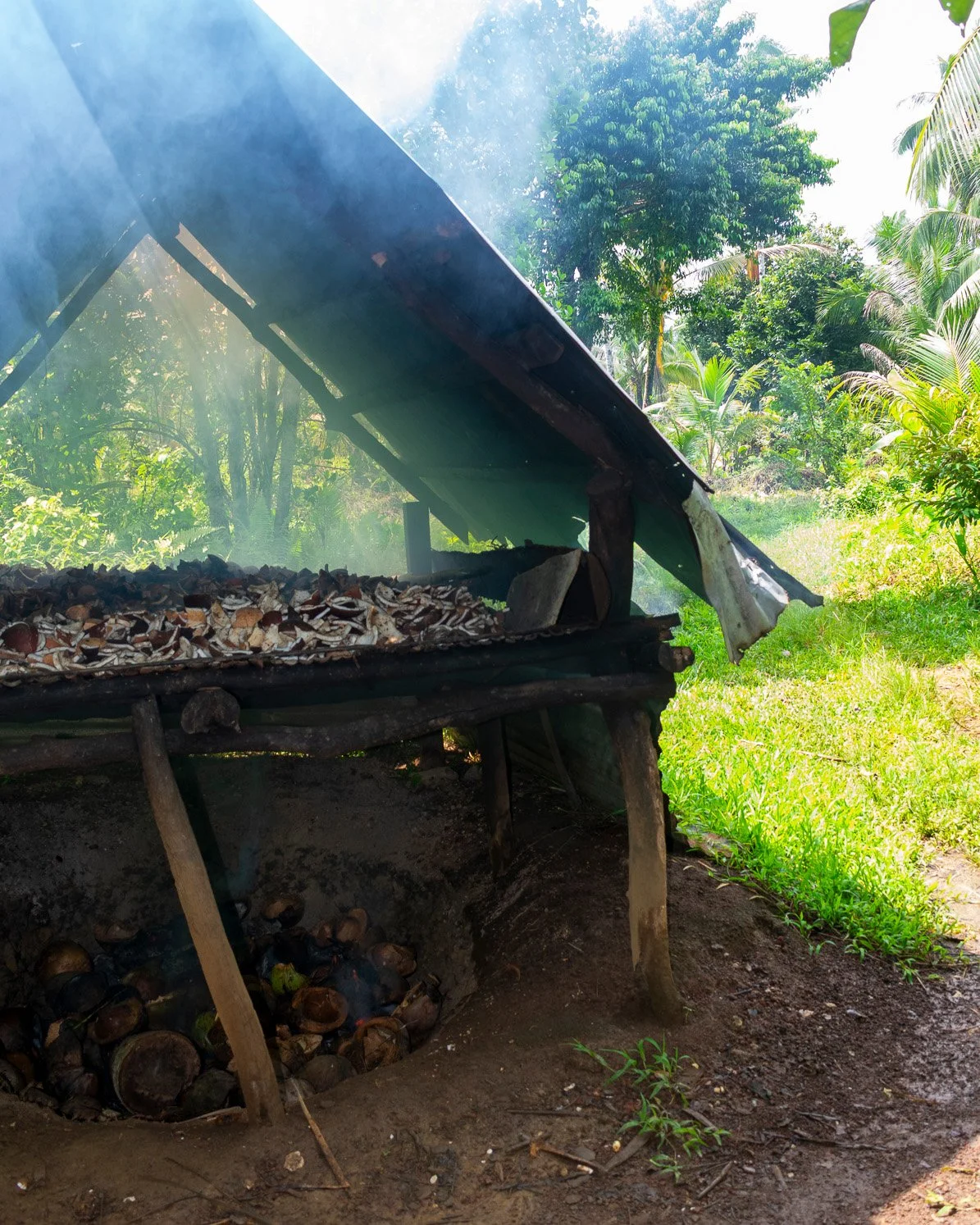 A hole in the ground where firewood or in this case coconut shells and husks get burned to smoke and dry the material one level above.